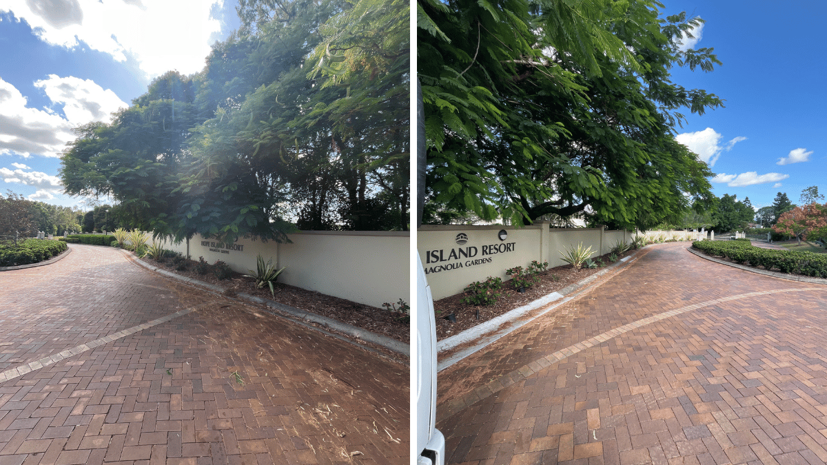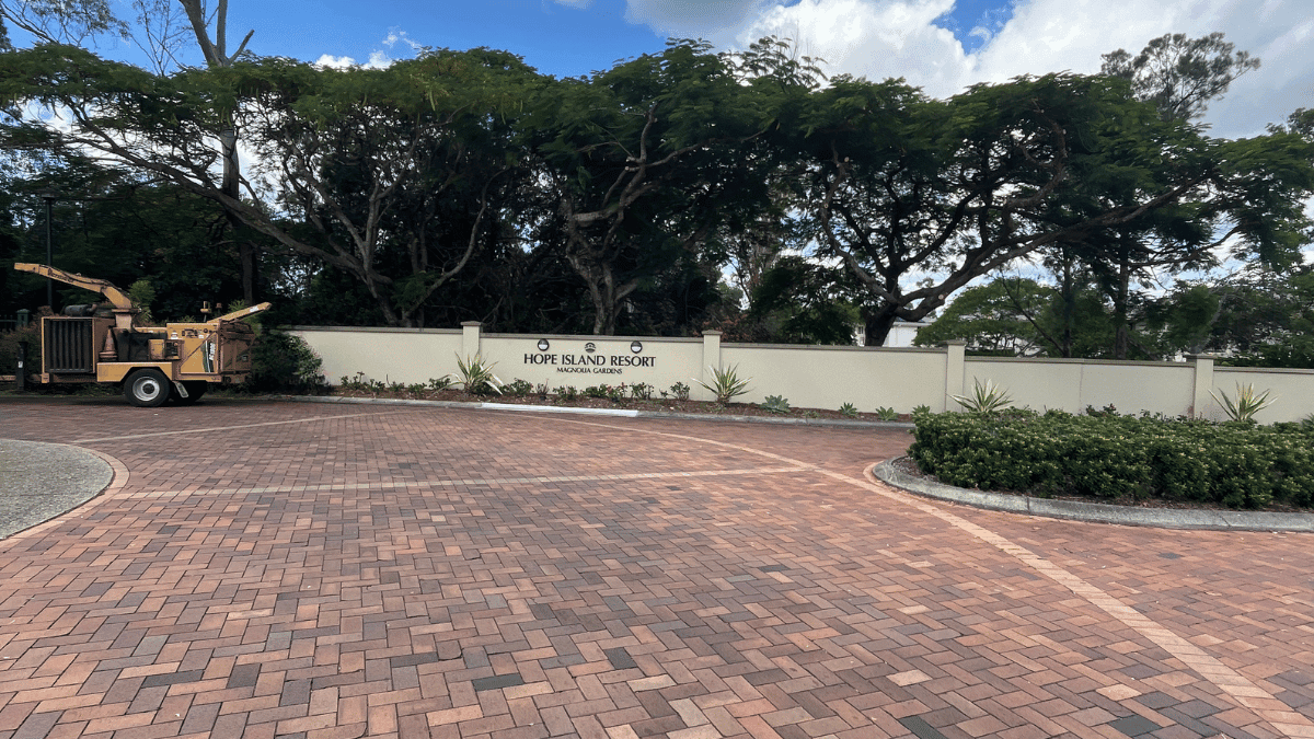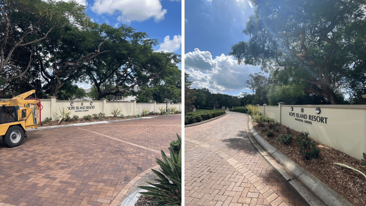 Hope Island Resort is lined with mature Poinciana trees that provide shade, habitat, and strong visual appeal. However, due to their broad canopy structure, limbs can extend significantly over roads and infrastructure.In this case, branches were encroaching over the roadway and obscuring a retaining wall street sign.